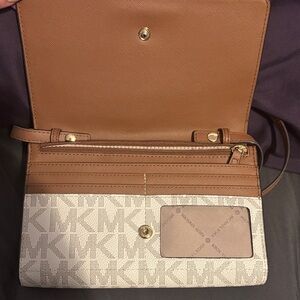 It's made from logo-print canvas/faux leather with contrasting smooth trim and includes gold-toned hardware and signature Michael Kors branding.