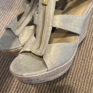 Stylish Michael Kors wedges. Beige fabric with gold zipper detail. Comfortable and chic design.
