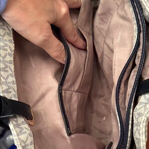 Elegant Michael Kors tote with white, black and gray. MK pattern. Black handles and gold accents. Ideal for everyday use.