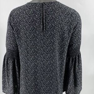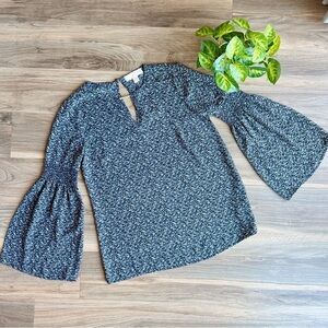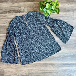 Keywords/Tags: Michael Kors blouse, floral long sleeve top, bell sleeve blouse, boho chic style, keyhole neck blouse, lightweight printed top, relaxed fit blouse, versatile layering piece, day to night top, black and white floral, statement sleeve style, soft feminine fashion, office to weekend wear, casual elegance, polished comfort, modern bohemian