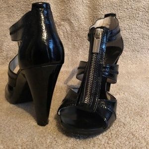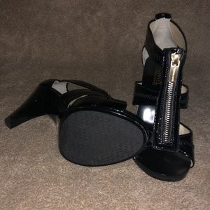 4" stack heel with a 1" platform, Almond open to toe t-strap. Platform sandals with zipper closure.