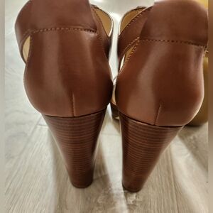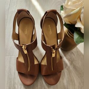 Elevate your style with these sophisticated brown T-strap heels from Michael Kors, featuring a smooth leather finish and a substantial chunky heel for added height and comfort.