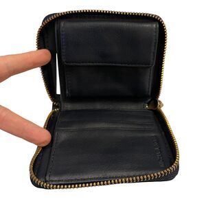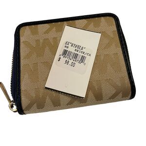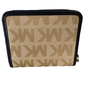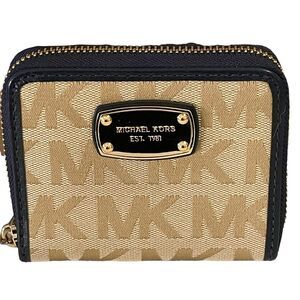 Michael Kors Bifold Wallet Small Zip Around Beige Camel Navy Blue Leather Trim