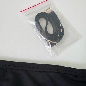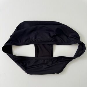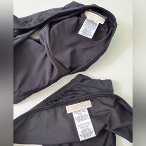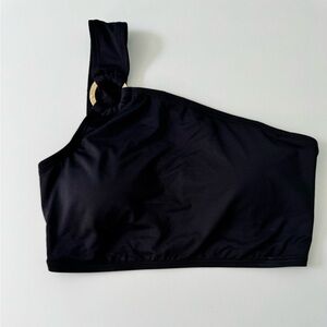 Classic black bikini by Michael Kors. Perfect for a sexy beach look. Top is a bandeau style with one shoulder strap with a gold logo detail. Extra strap included that can be attached to the other shoulder.