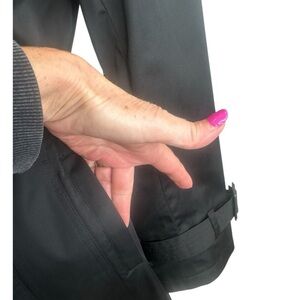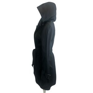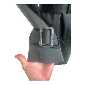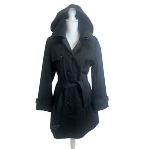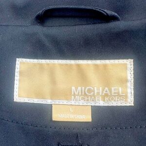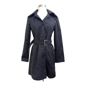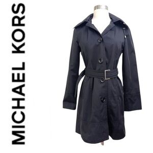 This classically styled trench coat is made of a polyester cotton blend. A modern twist on an outerwear staple, this trench coat features a waist-cinching belt with woven “KORS” lettering. It has all the details that make it a classic, including buckled cuffs. Adjust the drawstring hood to keep the wind at bay. The cuffs have buckles with straps that adjust. The belt has buckle that can be worn tied as show in picture or buckled. One button is loose.