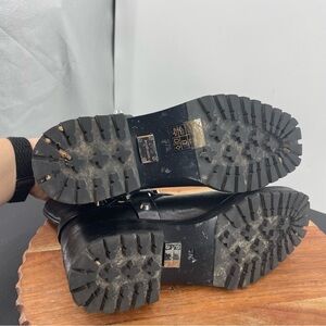 Sleek black leather ankle boots. Features buckle detail. Durable sole for comfort.
