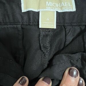 PREOWNED Michael Kors Bermuda shorts in classic black offer a sophisticated and versatile look. Crafted from a sturdy fabric, they are perfect for both formal and casual occasions. The tailored design ensures a polished appearance, making them a must-have addition to your wardrobe.