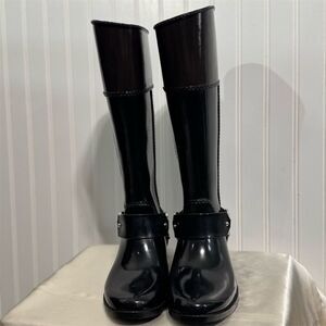 Michael Kors Black Brown Logo Harness Rain Riding Boots Size 7M Rubber Tall MK