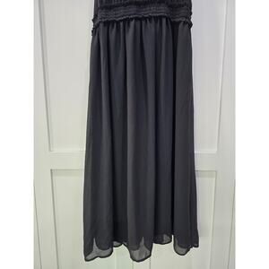 Elegant black halter dress with gold chain neckline detail. Features a soft chiffon overlay and a lined interior with a high-slit slip for movement and comfort. Stretchy elastic waist for a flattering fit. Perfect for cocktails, formal dinners, or special events.