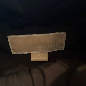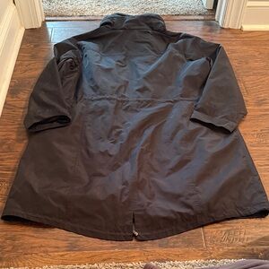 Chic black ski jacket with gold accents. Features a high collar and button closure. Ideal for winter sports.
