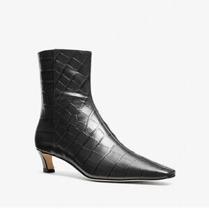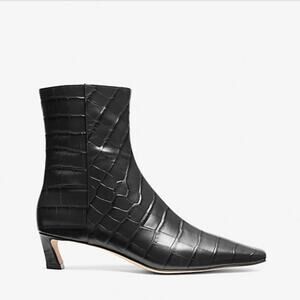 Michael Kors Black Cosmo Crocodile Embossed Leather Kitten Heel Bootie Boots 7