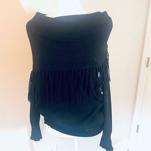 This stylish Michael Kors black cowl neck sweater features a subtle metallic reflection that adds a touch of glam to your outfit. The versatile design allows it to be worn either as a cowl neck with fringe or off the shoulder for a more daring look. Lightweight and comfortable, this long-sleeve sweater is perfect for layering or wearing on its own.