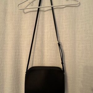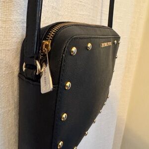 Elegant black crossbody bag by Michael Kors. Adorned with gold accents. Ideal for any occasion.