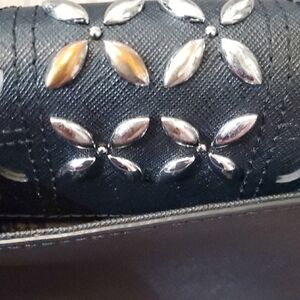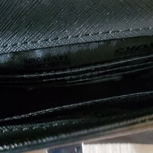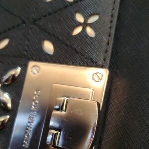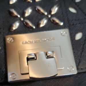 Chic black crossbody bag by Michael Kors. Features eye-catching silver accents and a sleek chain strap. Ideal for stylish outings. There are small scratches on the buckle area and a couple discolored spots on the rear silver accents. Please review all photos.