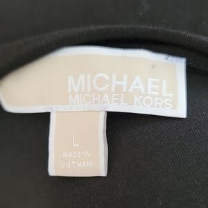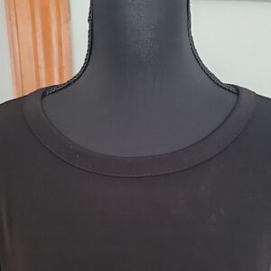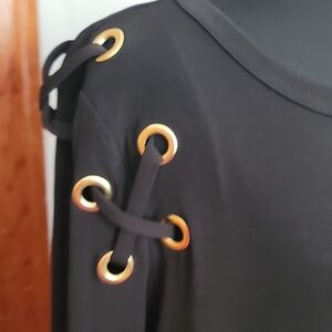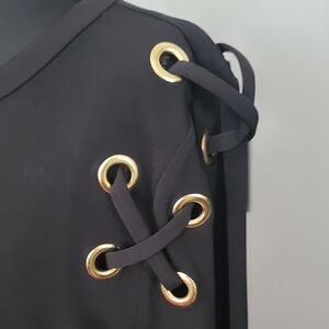Pre owned, in good condition. Not perfect. The is a small issue a on upper left side. Maybe from jewelry or a brooch. Chic black dress with striking gold eyelets. Long sleeves and elegant design.