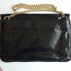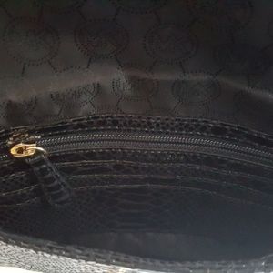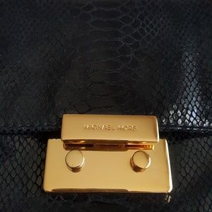 Michael Kors black clutch with gold hardware/short gold chain strap. 6 card slots on the inside of bag and a zip compartment! Super cute for holiday parties! Never used.