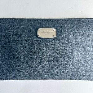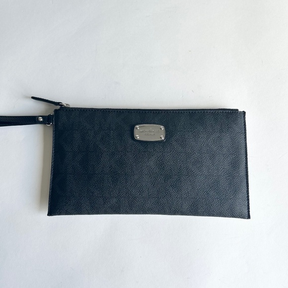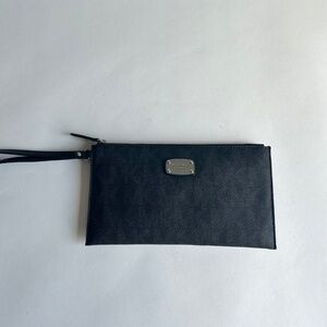 Michael Kors Black Grey Signature Logo Crossgrain Leather Wristlet. 10”W x 5.5”H, zipper closure, silver hardware, two compartments inside. In great condition, no signs of wear, gently worn one time.
