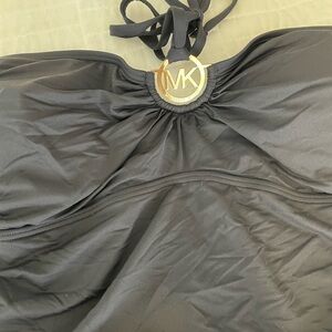 Michael Kors Black Halter Logo MK One Piece Ruched Swimsuit Sz 12 Large Bandeau