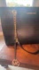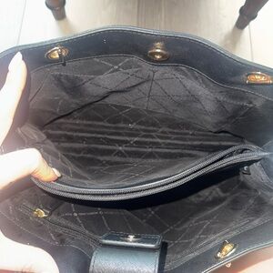 Elegant black handbag with gold chain straps. Features Michael Kors logo charm.