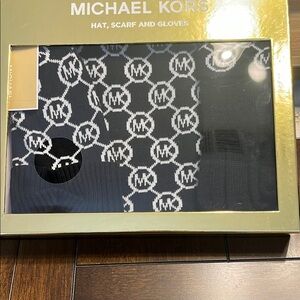 Stylish Michael Kors set. Includes hat, scarf, and gloves. Perfect for cold weather.