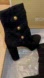 Elegant black heeled boots. Features gold button accents. Perfect for stylish outings.