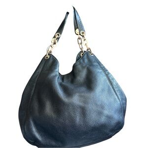 Large Chic black hobo bag by Michael Kors. Features gold accents and a spacious interior. “This bag is in excellent condition. Please note that the chain straps show some fading from gold to a chrome-like tone, and the leather straps feel a bit stiff along the edges. These details are minor and do not drastically affect the overall look, as they are barely noticeable.” Ideal for everyday elegance. Please see all pictures before sending any offer.