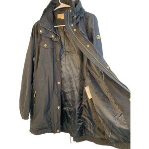 Michael Kors Black Hood Coat L Gold Zip Rain Wind Transition RR10487 Mid EUC
