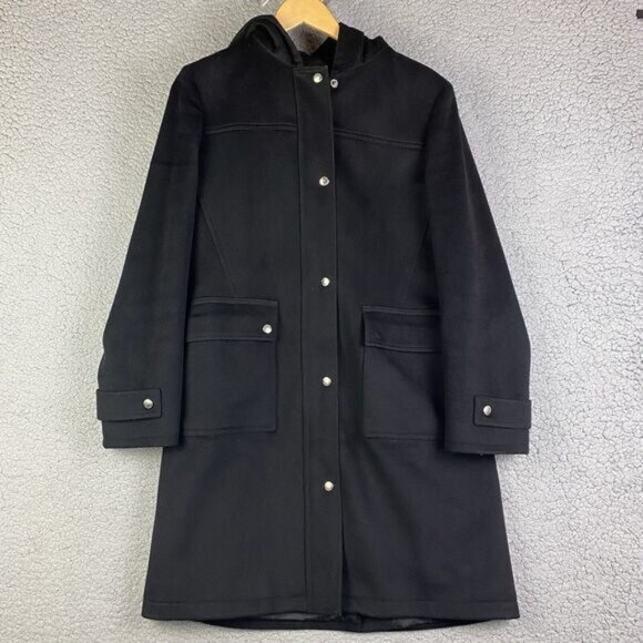 Michael Kors Black Hooded Wool Coat Women's Size 6 Mid Length Overcoat Lining *