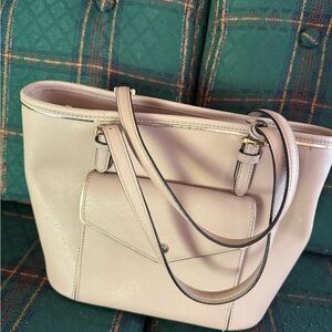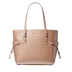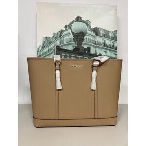 Structured black tote from Michael Kors. Saffiano leather exterior with a front flap pocket. Gold-tone MK charm and hardware accents. Clean lines and top handles for daily use.