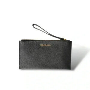 Michael Kors Black Jet Set Wristlet has pebble black leather is like new condition, no flaws. Includes 12 card slots, 1 interior slip pocket in the main pocket, gold tone hardware and black Michael Kors signature interior.