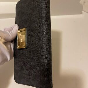 MK Michael Kors Black Jet Set Zip Around Wallet Silver Hardware. Condition is Pre-owned. Michael Kors black jet set zip closure wallet. Good condition. A few scratches on the name plate (view pictures) and some tarnishing on the zipper. Eight card slots, two large slots for cash etc., zipper interior portion for coins.
