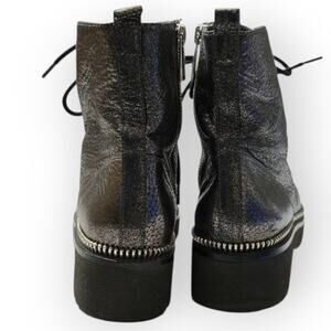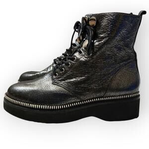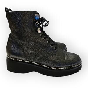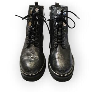 Edgy and stylish Michael Kors combat boots with black textured leather uppers, chunky platform soles, and silver hardware. Features lace-up fronts, side zippers, and MK logo details.