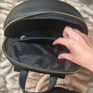 Elegant black backpack with pebbled leather texture. Brand new with tags. Features front zip pocket and gold-tone accents.
