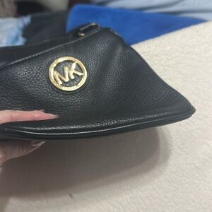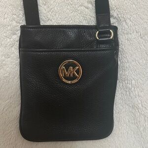 Elegant black leather crossbody featuring a gold MK emblem. Ideal for daily wear. Has one large envelope pocket on front inside has magnetic snap closure has two slip envelope pockets inside adjustable cloth Crossbody strap