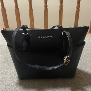 Chic black leather handbag by Michael Kors. Features elegant gold hardware and spacious interior.