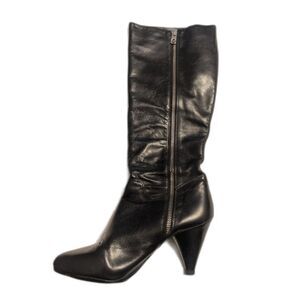 Step out in sophisticated style with these Michael Kors black leather knee-high boots. Featuring a sleek pointed toe, medium-height tapered heel, and form-fitting shaft with elastic back panel for stretch, these boots offer both comfort and elegance. Perfect for work, nights out, or chic everyday wear.