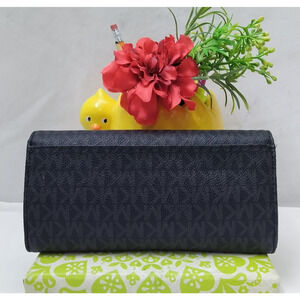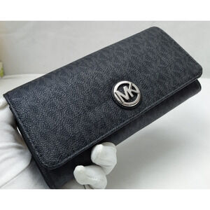 Michael Kors Black Leather MK Printed Round Logo Credit Card Bifold Wallet
