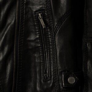 Discover the edgy allure of the Michael Kors Black Leather Moto Jacket, a standout piece in the Jackets & Coats category. Crafted from premium leather, this jacket features a sleek, fitted silhouette and classic biker elements like asymmetrical zippers and metallic hardware. Its cropped design offers a modern twist, making it a versatile addition to any wardrobe. 2 zippered pockets and zippered sleeve design.