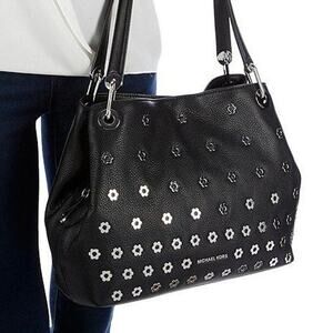 Michael Kors Black Leather Raven Silver Flower Studs Large Shoulder Tote Purse Handbag
