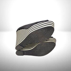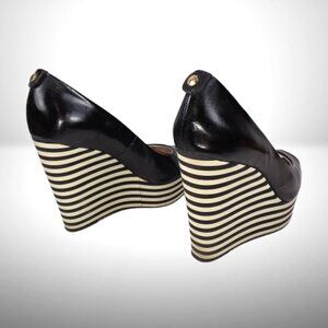 Michael Kors Black Leather Striped Peep Toe Platform Wedge Size: 7.5