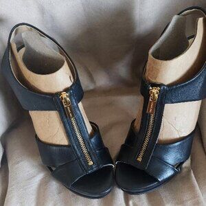 Michael Kors Black Genuine Leather T Strap Style; Berkley Open Toe Gold Zipper Sandal Heels Sz 8M Style HB18L Platform 1 inch sole with 4 inch heel