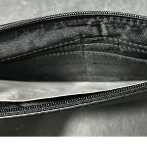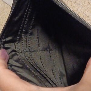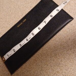 Sleek black leather wristlet by Michael Kors. Features a textured finish.