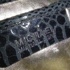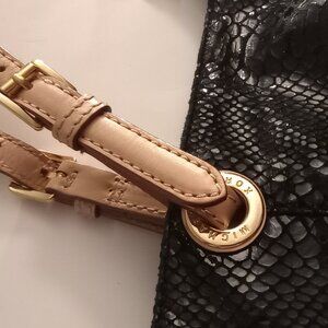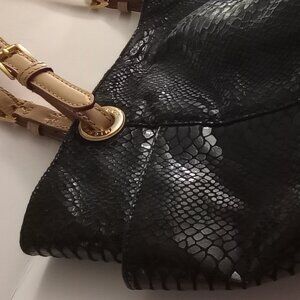 A Michael Kors tote bag is made of genuine python-embossed leather. This Michael Kors handbag features two adjustable top handles, gold-tone hardware, zip top, exterior slip pockets, interior color gold, interior zip and slip pockets, key fob, and a hanging Michael Kors logo medallion. Great preloved condition.