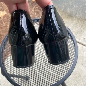 Chic black patent leather heels. Sleek design with a modern touch. Ideal for any occasion.