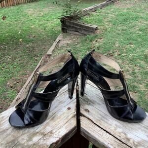 Michael Kors Black Patent Leather Vixen Heels 4" Chunky Zipper Strappy 9M