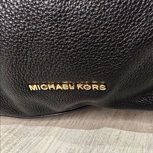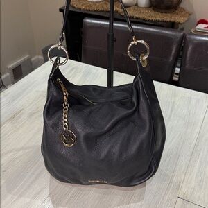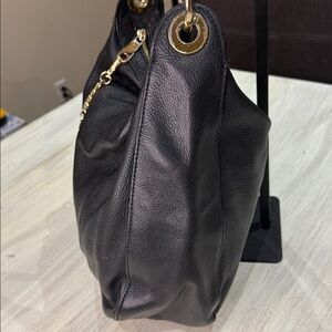 Elegant black leather hobo bag with gold-tone hardware. Features a chain charm and roomy interior.