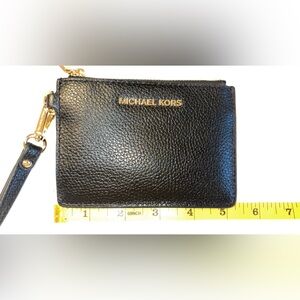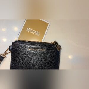 Chic black pebbled leather pouch. Gold-tone zipper and logo detail. Brand new.
