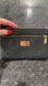 Elegant wristlet in black pebbled leather. Features gold-tone accents and a secure zip closure.