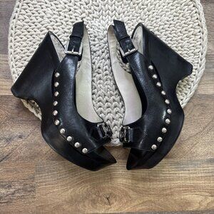 Michael Kors Black Platform Wedges Open Toe Slingback Shoes Size 9 Charm Logo