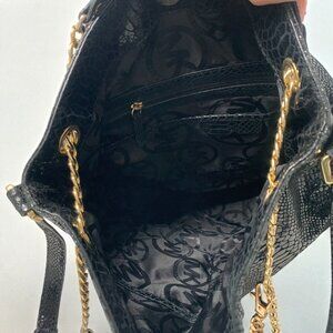 Michael Kors Black Python-Embossed Leather Tote Gold Chain Straps & Logo Charm